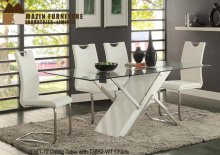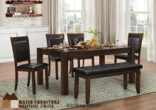 Today's modern trend toward mixed media finishes is perfected in this dining set. A composite stone center slab divides the dark espresso table to create a subtle yet elegant dining room. Padded high-back chairs are super comfortable, with their own graceful flare.