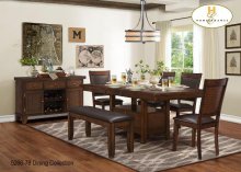 Recreate the expansive warmth of a country manor with this impressive dining collection. Block legs support a planked harvest table top, adapting industrial elements with rivets on metal edge trim. The heft continues with substantial wood chairs in a complimentary neutral fabric seat. The accompanying buffet and hutch encompasses all your needs, from glass display to wine glass and bottle storage. The island cart on wheels is fully finished front and back, and is a magnificent addition.