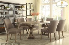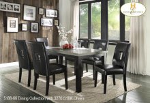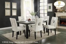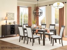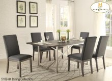 The Piqua Collection. Bold accenting and a trend driven grey finish immediately draw your eye to this modern collection. The table apron server doors and coordinating chairs are all stylishly highlighted with distinct fluted accent. Flanking the table are the wood framed chairs with ivory textured bi-cast vinyl seats and backs.