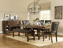 The Urbana Collection. Turnbuckle accents paired with faux rivets lend to the design of the table and accompanying server. A burnished finish is utilized to highlight the wood grain veneer. The wood framed metal X-backed chairs feature dark brown bi-cast vinyl seats and backs. The server features drawer and door fronted storage along with wine rack and stationary leg supports that mimic industrial cart wheels.