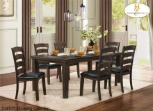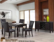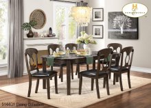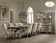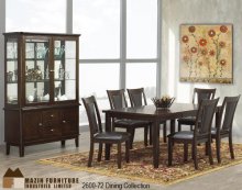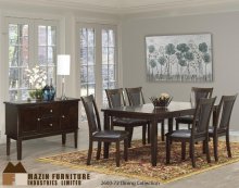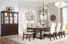 The Yates Collection. Blending the look of country style with the popular modern industrial aesthetic, the Yates Collection manages to achieve a look that is unique unto itself. The turned legs of the trestle base rise to support the burnished dark oak table top. Neutral fabric covered chairs feature wood support legs with a unique turned block look and nailhead accent. The accompanying china’s mirrored back, display shelving, light feature, lower door storage, and drawer storage provide ample room to show off your table top accessories. The look of turned pilasters and framed panel doors further lend to the stylish collection.