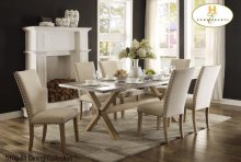 The Luella Collection. Zinc table top is supported by X-frame bases in this casual dining. The table is flanked by coordinating chairs, each with a neutral tone fabric and mail head accent. Completing the look is a cool weathered oak finish that serves as the perfect contrast to the natural grey tone of the zinc table top.