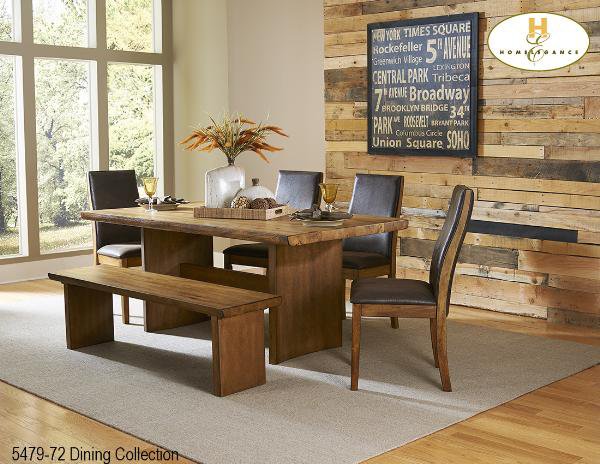 | Rustic Dining Collection with a live-edge solid top and trestle base featuring a bench and fabric chairs. |