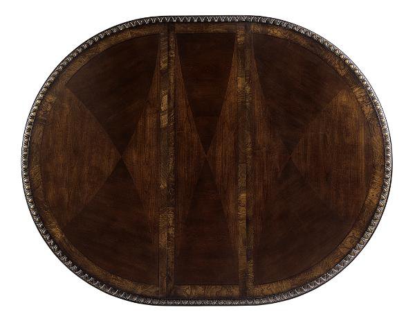 | The Bonaventure Park Collection. With styling that exemplifies traditional design, the Bonaventure Park Collection exudes sophistication and refined elegance. Cantered pilasters frame the serpentine fronted china and server, while egg and dart molding, acanthus leaf motif and bale, and button hardware lend to the traditional look of all pieces. Burl inlay creates beautiful contrast to the gold-highlighted cherry finish of the collection. Two table options provide flexibility for placement in your dining space – the first, a 110-inch double pedestal base rectangular top table, the second, a 76-inch oval top single pedestal base table. Button-tufted traditional tweed fabric features prominently on the accompanying wood-framed chairs. |