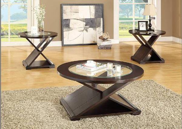 | The Sarasota Collection. The unique design of these tables allows you to see through the round glass in-lay and view the striking interlocking X-base. The additional of a bottom shelf for storage completes the overall artistic presentation. |