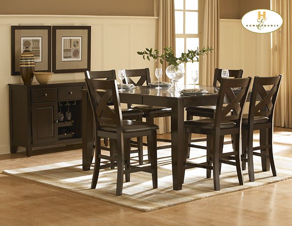 | The Crown Point Collection. Adorn your dining area with this collection. This grand scale casual dining in warm merlot finish is a strong and durable as they are stunning. Table top is constructed of mango veneer with strong support tapered legs. Attractive X-back dining chair with comfortable leather-look dark brown seat completes the unsophisticated streamlined look. |