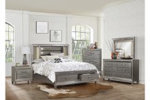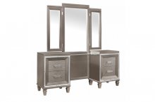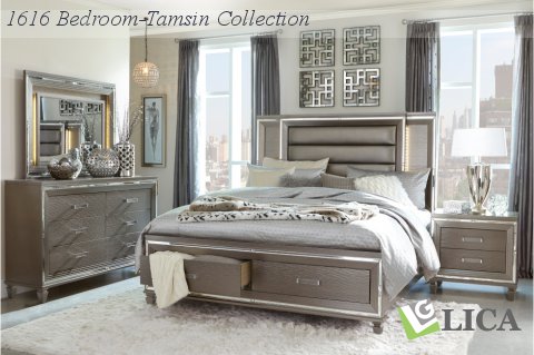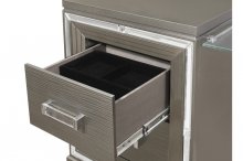 Designed to help your bedroom reach its full glamorous potential, the Tamsin Collection’s unique attributes blend to create a stylish and functional addition to your lifestyle. Mirrored framing provides dramatic enhancement to each piece in the collection, while LED back-lighting, from the vertical headboard panels and mirror, illuminates and highlights the silver-grey metallic finish of the collection. Acrylic hardware provides unobtrusive decorative touch to the drawer fronts of the case pieces and storage footboard, with the metallic silver faux leather-covered padded headboard insert lending decorative contrast to the finish of the collection. Hidden jewelry drawers in the dresser create discrete storage space for your fancy accoutrements. Also providing functional display to the collection is the available vanity. The mirrored front paired with drawer storage creates the perfect platform to prepare your glamorous self.