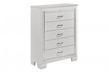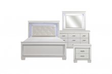 Glamour reigns in the design of the Allura Collection. Framing each piece is a decorative beveled mirror accent that enhances the illumination from the touch-engaged LED backlight of the headboard and mirror, as well as the under-light of the night stand. Alligator embossing and high polished crystal-enhanced hardware boldly accent the white finish as does the pearl-white faux leather crystal-tufted headboard insert of the collection.