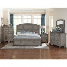 Transitional styling is paired with classic appointments and modern technology to create the Lavonia Collection. The eye-catching dramatic curved California King panel bed creates instant appeal when taking in the design. The framing of the headboard carries over to the design of the footboard. A gray wire-brushed finish over ash veneer furthers the classic look of this bedroom collection.