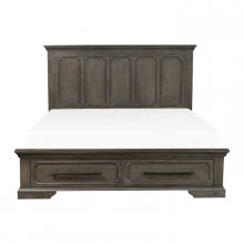Classic framing provides elegant contrast to the unique rustic look of the Toulon Collection. Distressed dark oak finish provides texture to the acacia veneer of this lovely queen size bed. The functional drawers of the footboard allow for additional storage within your bedroom. The French provincial inspired routing lends decorative touch to the profile, while dual drawer drawers of the footboard are accented with wide set horizontal metal.