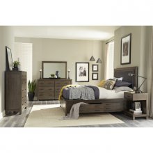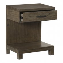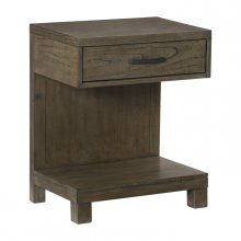 Clean lines blend with a soft rustic look to create the unique style of the Lantham Collection. The nightstand’s functional design allows for extension of the side rail drawer of the coordinating bed. Flat black bar hardware fronts the drawer of the nightstand serving as complementing contrast to the brown-gray finish that graces the mindy veneer.