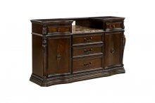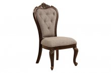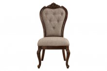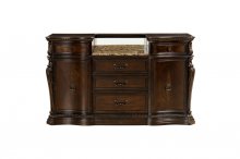 With styling that exemplifies traditional design, the Bonaventure Park Collection exudes sophistication and refined elegance. Cantered pilasters frame the serpentine fronted china and server, while egg and dart molding, acanthus leaf motif and bale, and button hardware lend to the traditional look of all pieces. Burl inlay creates beautiful contrast to the gold-highlighted cherry finish of the collection. 76-inch oval top single pedestal base table provides flexibility for placement in your dining space. Button-tufted traditional tweed fabric features prominently on the accompanying wood-framed chairs.