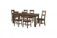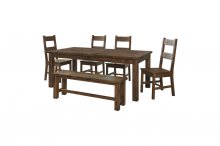 Classic transitional design serves as a base for the natural qualities of the solid wood utilized to create the rustic look of the Jerrick Collection. The rustic look of the fixed-top dining table, bench, and coordinating chairs is enhanced by the burnished finish over the solid wood grain, allowing each plank to serve as a unique accent to the overall design of the casual dining group.