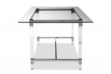 The whimsical, translucent rectangular Lyrica dining table will blend seamlessly into any modern décor. Sophisticated and stylish, the thick beveled glass top floats atop artistic metal bars punctuating transparent acrylic legs for a truly whimsical feel. Partnered with a variety of gorgeous side chairs, it's sure to be a showcase in your dining space.