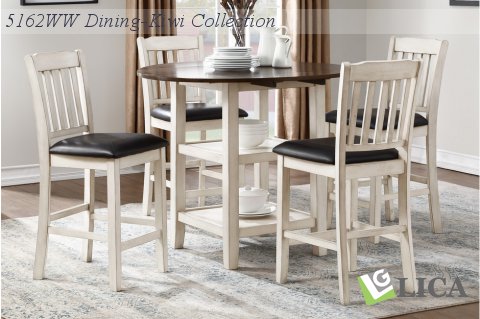 Perfectly scaled for your cozy dining space is the Kiwi Collection. The two-tone finish of the group – white wash and dark cherry – serves to highlight the mindy veneer. Drop leaf sides allow for placement or storage within your space that is quick and convenient for your lifestyle. The wood chairs feature dark brown faux leather seats that contrast the white wash finish of the chairs. An open shelf base allows for the display of your tabletop accessories.