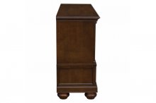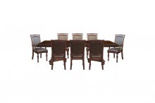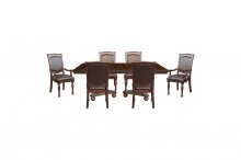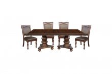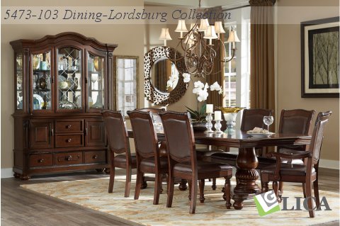 Elegantly designed for the traditional dining room is the Lordsburg Collection. Supported by the double pedestal base is the tabletop where the magnificent parquet veneer is highlighted by the brown cherry finish that covers the collection. Heavily carved molding provides distinct accent to the tabletop while brown faux leather covers the seats and backs of the coordinating wood-framed chairs. The accompanying hutch and buffet provide ample storage space for your tabletop accessories.