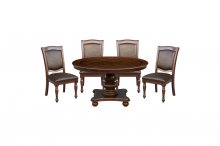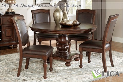 Elegantly designed for the traditional dining room is the Lordsburg Collection. Supported by the pedestal base is the table’s round top where the magnificent parquet veneer is highlighted by the brown cherry finish that covers the collection. Heavily carved molding provides distinct accent to the table’s top while brown faux leather covers the seats and backs of the coordinating wood-framed chairs.