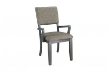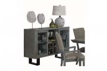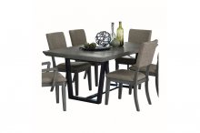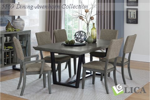 Modern styling is softened with the juxtaposition of metal finish and wood in the Avenhorn Collection. The wood table top and flanking chairs feature a gray finish that clearly accentuates the distinct grain pattern. Black-metal-finished wood framing supports both the table and available server. The gray fabric that covers the side and arm chairs creates additional visual contrast to the collection.