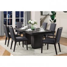The striking profile of the Larchmont Collection is an intersection of texture, material and style. The charcoal finish over ash veneer serves as a bold complement to the clean lines of the table. A block-style double pedestal rises to support the table’s top.