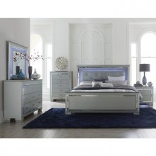 Glamour reigns in the design of the Allura Collection. Framing the California King bed is a decorative beveled mirror accent that enhances the illumination from the touch-engaged LED backlight of the headboard and mirror, as well as the under-light of the night stand. The silver faux leather crystal-tufted headboard insert boldly accents the silver finish.