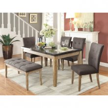 Combining the look of natural elements with transitional styling, the Huron Collection will be a welcome addition to your home casual dining space. Placed atop legs that feature the look of weathered wood, is the gray fabric-covered button-tufted upholstered seat of this 49-inch bench. The classic profile of the bench will lend neutral accent to your dining space.