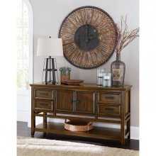 With a subtle lodge look that takes inspiration from design history, the classic styling of the Frazier Park Collection will help you create a dining room environment that is a reflection of your preference for traditional spaces. The brown cherry finish, that highlights the mindy veneer, provides rich character to the wood’s grain. Horizontal fixed knob hardware fronts the functional drawers and doors of the server and china, creating subtle contrast to the collection’s finish.