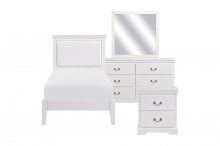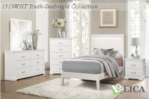 Merging traditional and transitional design creates the look of the Seabright Collection, providing a unique platform from which to style your bedroom. The white painted finish allows for exceptional versatility of placement and decorative inspiration. The bed features framed, color-coordinated, faux leather padded headboard insert and an ultra-low-profile footboard. The traditional styling of the satin nickel bale and pull hardware lends to the classic profile.