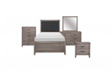 Industrial design is subtly used to achieve a cool look for your bedroom in the Woodrow Collection. Dark metal hardware and corner banding with rivet look lend to the casual look of this bedroom group. Melamine laminate features a weathered-wood look that furthers the intended design. Black faux leather accents of the headboard provides distinct complementing contrast to the finish of the collection.