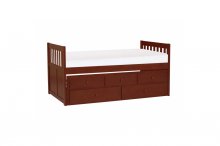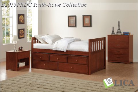 Maximizing sleep space is achieved with the stylish Rowe Collection. This transitional bedroom group is featured in a dark cherry finish making it an appropriate choice for a number of youth bedroom settings. With twin over full, twin over twin, full over full configurations – along the newly available captains bed, with trundle that features two drawers, and twin/twin bunk with storage stair steps - the design allows you to choose the size that is right for your family. Two under bed options are available for the bunk beds – toy boxes that provide additional storage space or twin trundle that offers additional sleep space.