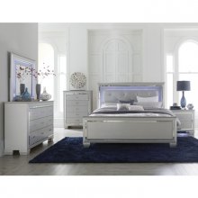 Glamour reigns in the design of the Allura Collection. Framing the Full bed is a decorative beveled mirror accent that enhances the illumination from the touch-engaged LED backlight of the headboard and mirror, as well as the under-light of the night stand. The silver faux leather crystal-tufted headboard insert boldly accents the silver finish.