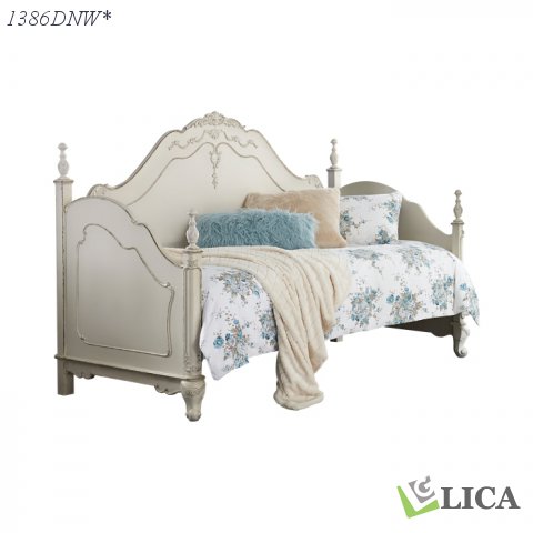 The Cinderella Collection is your little child’s dream come true. The Victorian styling incorporates traditional floral motif carving details on the white with gray rub-through finished twin daybed that will create the feeling of stepping into a fairy tale. Carved finials top the corner posts of each post further lending to the classic look. Chest, dresser, mirror, nightstand, TV armoire, lingerie chest, desk, hutch, desk chair, twin canopy poster bed, twin trundle, full canopy poster bed, twin bed, full bed and queen bed are also available. Link spring is not included.