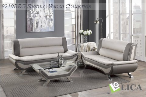 Bringing to mind the sleek styling of an Italian race car, bold contemporary styling creates eye-catching drama for your living room with the Veloce Collection. Color blocked beige and gray faux leather covers the ultra-low profile seating and accompanying glass-topped cocktail table, while chrome legs provide support.