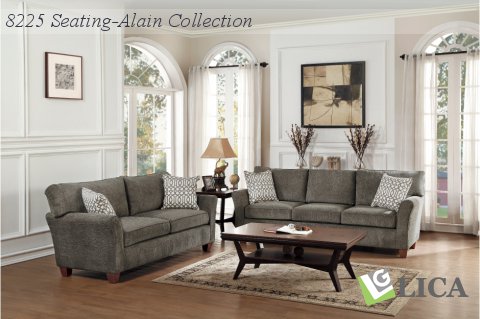 The perfect addition to your casual transitional living room is the Alain Collection. Amply appointed back and seat cushions provide the ultimate in comfort, while matching toss pillows lend a decorative touch. Brownish gray fabric provides visual and tactile interest.
