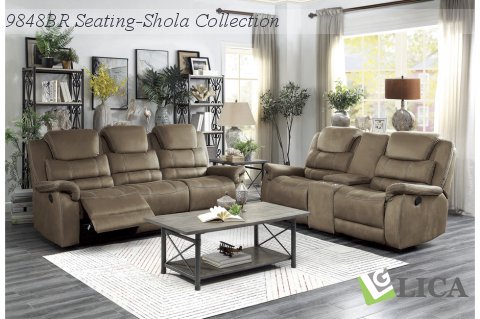 Styled for the transitional home, the Shola Collection is a comfortable and functional addition to your living room. Brown polished microfiber with contrast stitching, making it a neutral decorative choice for a number of home environments. The power motion reclining and headrest mechanism, once engaged, operates to take you from seated to reclined in an easy motion with personalized head support. The sofa features dual reclining ends, as does the love seat. The sofa has a drop-down center back that reveals cupholders, flat surface, USB port and power supply. The love seat features a center console with cupholders and lift-top storage. The collection is also available in manual pull version.