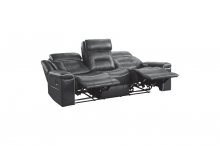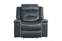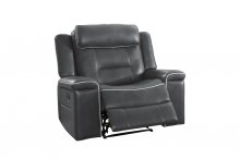 Soft contemporary styling makes the Darwan Collection a comfortable and functional addition to your living room. Dark gray, with light gray contrast premium faux leather making the collection a bold decorative choice for your modern home. Manual motion mechanisms operate with the pull of a side-mounted tab, that once engaged, take you from seated to reclined in an easy motion. The sofa features dual reclining ends, as does the love seat. Providing additional function to the collection are the extended reclining mechanism installed on chair, love seat and sofa that allows for further extension than the average recliner.