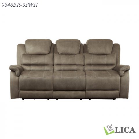 Styled for the transitional home, the Shola Collection is a comfortable and functional addition to your living room. Brown polished microfiber fabric with contrast stitching, making it a neutral decorative choice for a number of home environments. The power motion reclining and headrest mechanism, once engaged, operates to take you from seated to reclined in an easy motion with personalized head support. The sofa features dual reclining ends and a drop-down center back that reveals cupholders, flat surface, USB port and power supply.
