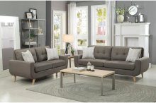 Mid-Century modern design is the inspiration for the Deryn Collection. Wide, dramatically curved arms rise to the straight back that is synonymous with this classic style. Contrast toss pillows and an additional chair option are featured in a modern gray herringbone pattern to complement the gray fabric seating body covers. Tailored stitch tufting lends further accent to this thoroughly love seat.