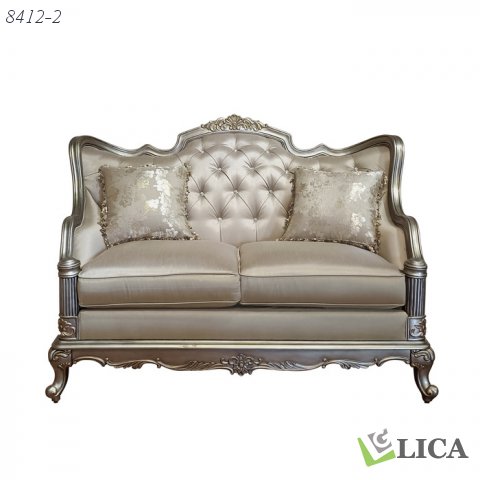 The elaborate designs of Old World Europe are treated with a distinct modern touch in the Florentina Collection. The eye-catching jewel tufting reflects with a brilliance intended to accentuate the dusky taupe coloring of the silk like fabric and the rich silver, with gold undertone finish of the show wood frame. With details such as shell and acanthus leaf scrolling, routed pilaster and cabriole legs, the traditional look of the love seat is solidified. The accenting silk like toss pillows feature traditional fringe detailing and a complementing detail pattern. The series 8412 Florentina Seating and Occasional Collections complement the Homelegance series 1867 Florentina Bedroom and Dining Collections.