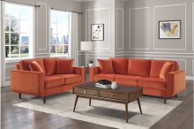 The refined profile of Mid-Century inspired design gets a modern update in the Rand Collection. Velvet covers this stylish seating group, its vibrant navy perfectly complementing your modern decorative environment. Track arms flow to meet the base rails of the love seat, while back cushions are fronted by coordinating toss pillows, a bold monochromatic statement solidifying the classic look.
