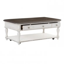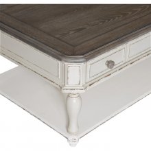 Inspired by the look of French Provincial styling, the Willowick Collection lends an air of classical romanticism to your opulent living room. Bold curves, elegant framing and the lightly distressed finish create eye-catching drama while antiqued hardware and turned feet are the decorative accouterment that ties the look together. Subtle rub-though of the antique white finish reveals gray undertones, that when paired with brown cherry finished tops, serves to highlight the poplar solids, along with the ash veneer. Drawers and open display shelving provide additional function.