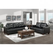 With a profile that hints at modern design and a color palette that serves as a neutral accent to your home, the Hinsall Collection will be a welcome and comfortable addition to your living room. Premium faux leather upholstery covers this love seat and is available in black for versatile decorative styling. Track arms and contour stitch tufting further lend to the modern look.