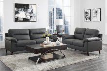 The streamlined styling and plush seating of the Hattie Collection combine to create the perfect seating option for your home’s modern living room. The subtly splayed legs that provide support to the love seat feature a brown finish that complements the gray faux leather that covers the piece. The tufted contouring that defines the seat back and the slightly flared pillow top arms lend to the plush comfort and modern design of your seated experience.