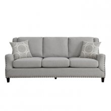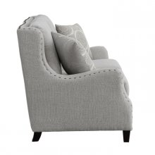An air of elegance surrounds the Halton Collection, from its deeply curved arms to its classic accents, this seating group will provide the traditional feel you are looking to achieve in the design of your living room. The contoured recessed arms that anchor the love seat are defined by nail head trim and supported by espresso finished legs, each element providing subtle contrast to the gray textured fabric upholstery. Further accent comes in the form of the contrast toss pillows.