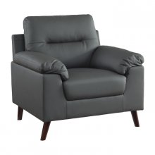 The streamlined styling and plush seating of the Hattie Collection combine to create the perfect seating option for your home’s modern living room. The subtly splayed legs that provide support to the chair feature a brown finish that complements the gray faux leather that covers the piece. The tufted contouring that defines the seat back and the slightly flared pillow top arms lend to the plush comfort and modern design of your seated experience.