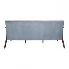 The frame of the Carlson Collection recalls a time when simplicity of profile was the height of style. The streamlined design of the sofa's subtly sloped wood arms and legs is finished in dark walnut which serves to highlight the blue-gray velvet covering.