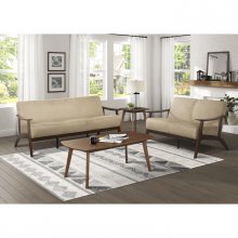 The frame of the Carlson Collection recalls a time when simplicity of profile was the height of style. The streamlined design of the sofa's subtly sloped wood arms and legs is finished in dark walnut which serves to highlight the light brown velvet covering.