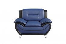 Sleek styling gives way to subtle curves creating the bold contemporary styling of the Matteo Collection. Color blocked blue and black faux leather covers the ultra-low-profile sofa, love seat and chair while chrome legs provide support. Perfect complement to the collection comes in the form of the coordinating glass-topped cocktail table.