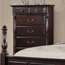 The best of traditional style has been carefully assembled to create your ultimate bedroom suite. The Townsford Collection features turned pilasters and classic framing that accent the profile of the chest's design. Antiqued pewter knob and bale and pull hardware accent each case piece as do the bun feet that provide support. The rich dark cherry finish on cherry veneer further compliments this elegantly understated offering.