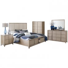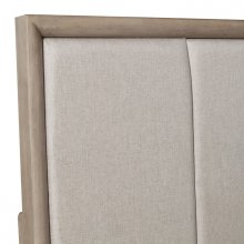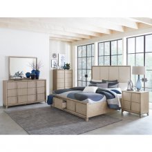 The sophisticated modern styling of the McKewen Collection brings refined design to the elegant space of your bedroom. The oak veneer, over poplar solids, is finished in a light gray finish that is perfectly complemented by the neutral tone of the headboard’s fabric. Providing additional storage beyond the case pieces are the footboard drawers.