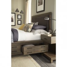 Clean lines blend with a soft rustic look to create the unique style of the Lantham Collection. The California King platform panel bed features side rail storage and brown faux leather padded headboard insert. Flat black bar hardware fronts the drawers of the bed’s side rails, serving as complementing contrast to the brown-gray finish that graces the mindy veneer.